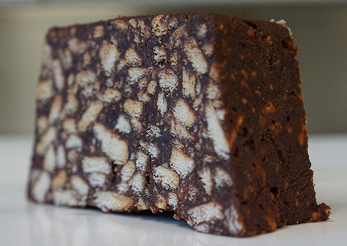 Smelt de boter en smelt de chocolade. Vet een cakevorm in met boter en leg er bakpapier in. Meng de boter met de basterdsuiker en de cacaopoeder. Breek de koekjes erboven, schenk de chocolade erdoor en roer goed door. Schep het mengsel in een cakeblik en druk goed aan. Laat de cake circa 2 uur opstijven in de koelkast. Haal de cake uit de vorm, verwijder het bakpapier en snijd de cake in plakken.